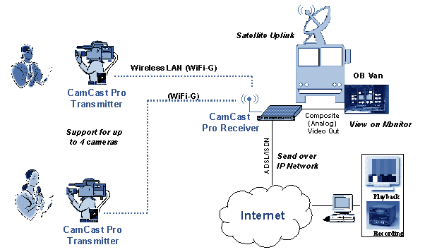 Each system can stream up to four cameras simultaneously at the same site. The CamCast Professional Receiver provides monitor viewing and enables transmission by up-linking or sending over an IP-based network.